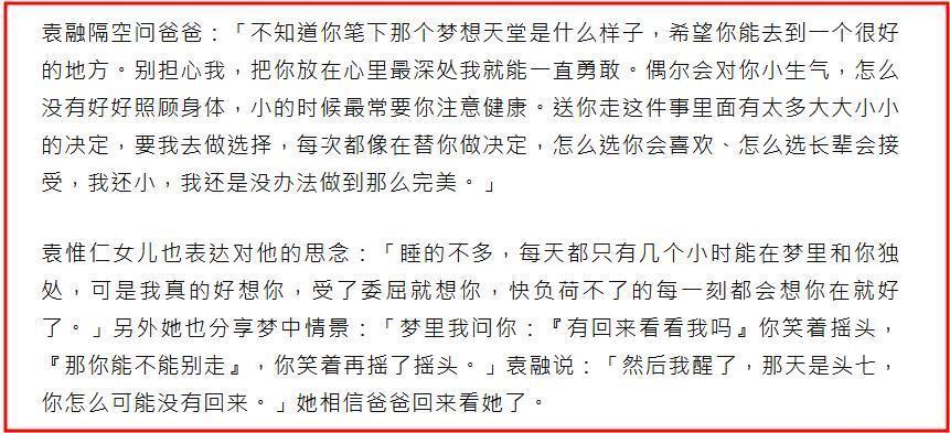 在长文中,女儿袁融先是写道:爸比,送你走了哟,今天很冷,显得大家的温暖特别强烈。很多叔叔阿姨都来送你了。我想再一次的感谢,一路以来陪在爸爸、家人身边、一直帮助爸爸也帮助我们的叔叔阿姨们。有大家的陪伴跟帮助,我们才能好好的顺利的送爸爸。