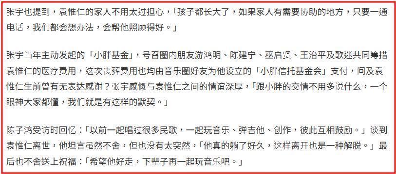 台媒问他对于他和圈内朋友成立“小胖基金”,袁惟仁生前有没有表达过感谢?张宇直言:“跟小胖的交情不用多说什么,一个眼神大家都懂,我们就是有这样的默契”。