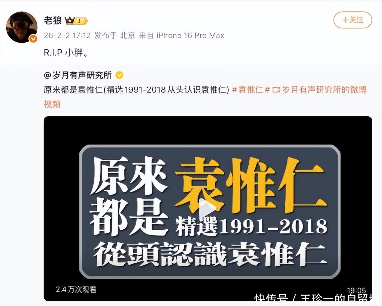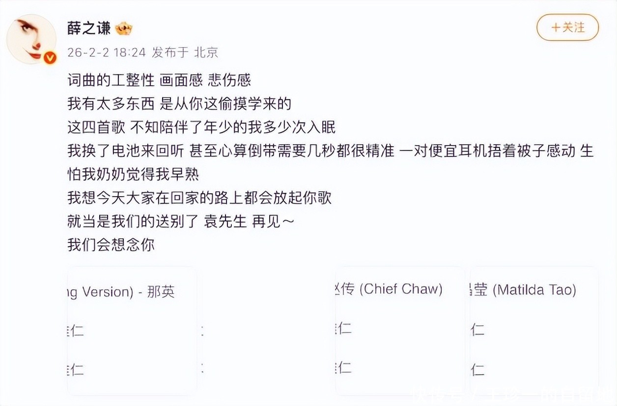 值得一提的是,也是在告别仪式这一天,内娱的那英、老狼、薛之谦、陈楚生等歌手,也纷纷发文悼念了袁惟仁。